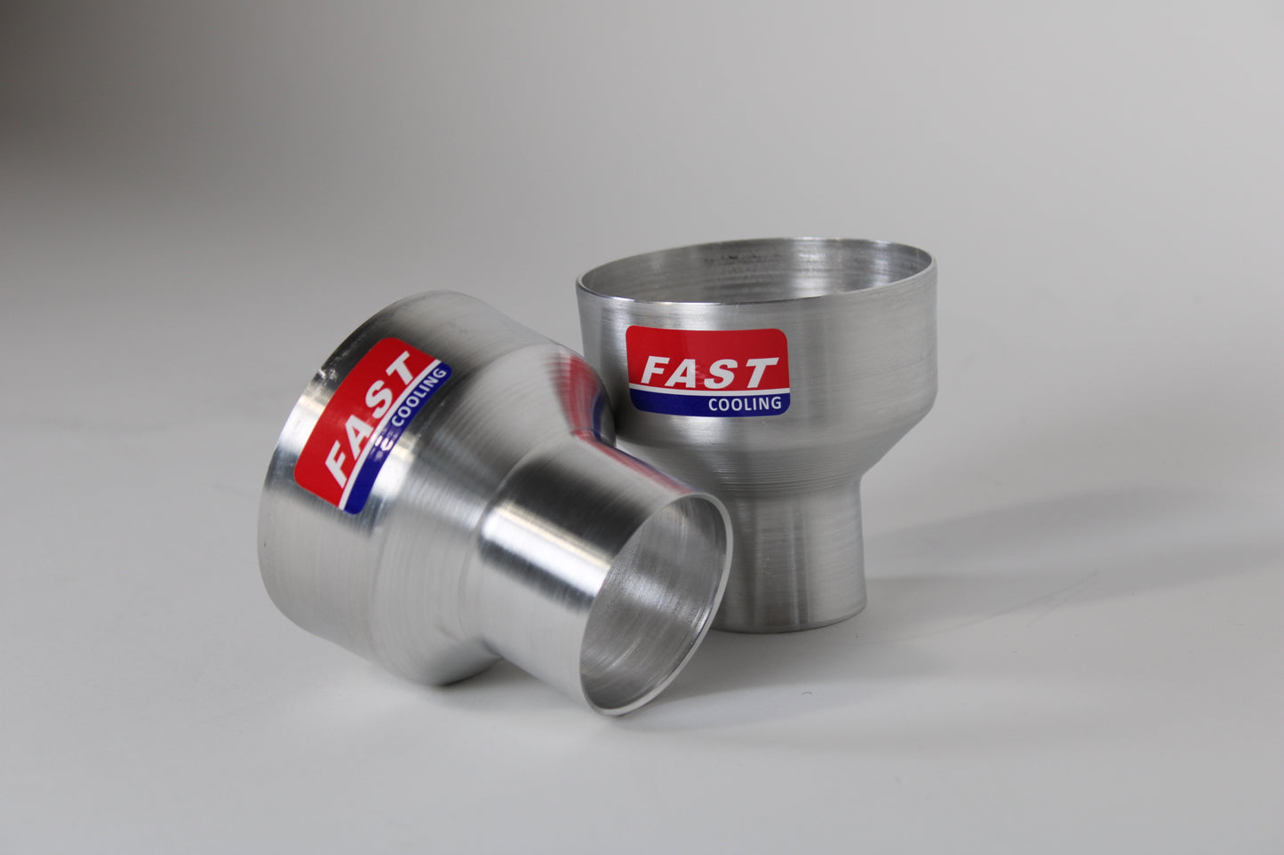Reducers and Ports are all polished lightweight spun aluminum that is corrosion resistant and can withstand high temperatures. The design allows for transitions between 3 inch and 1.5 inch. Installation is easy, using our FAST Fittings, and duct tape or duct clamps to connect the duct adapter. Air entrance ports are used as NACA ducts for hose feeds, and are also used by racers for body panel sleeves.