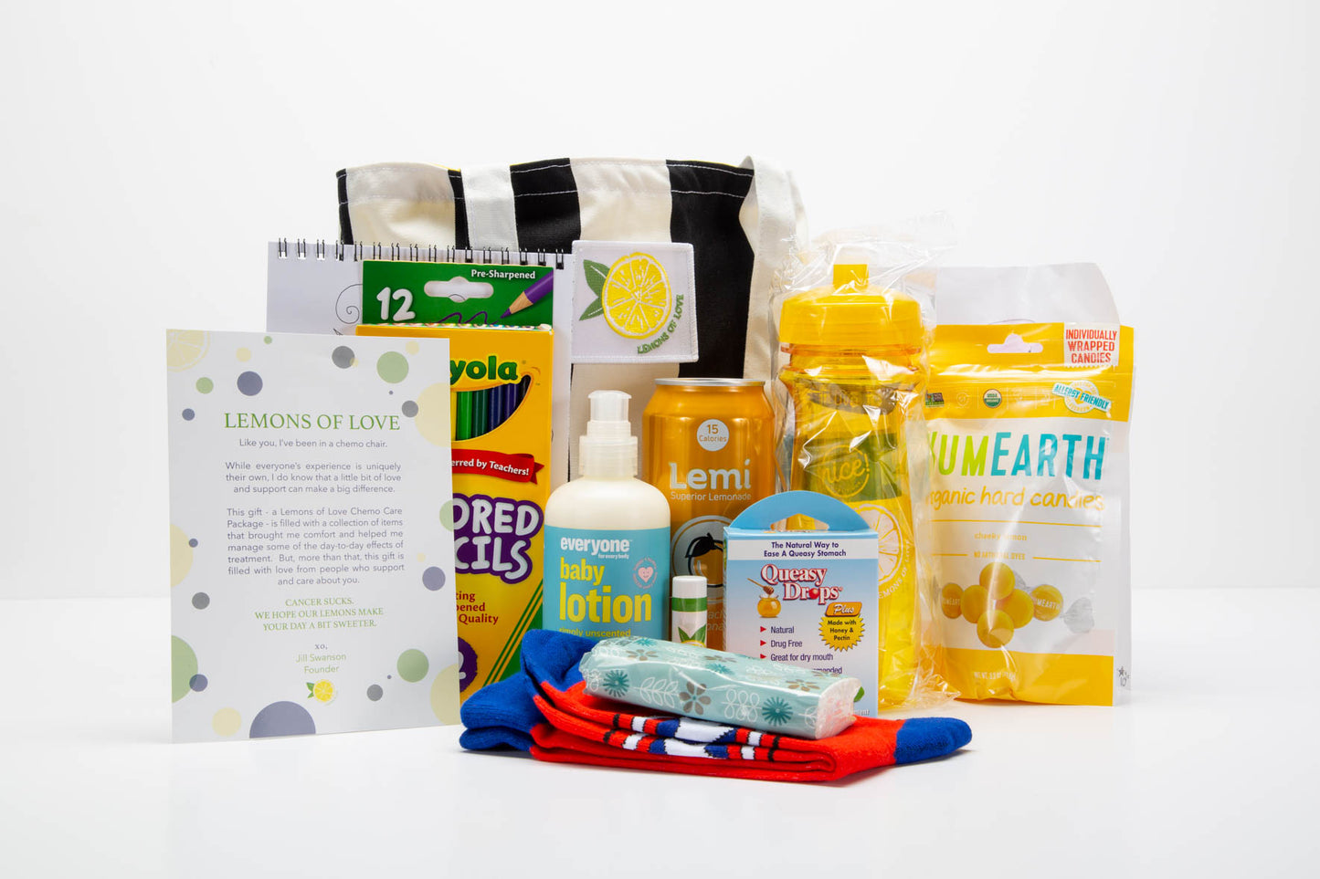 The original Lemons of Love Chemo Care Package was created by Jill while she was going through treatment for cancer. She called it her “making lemonade” project, as she shared gifts with others. The package is filled with carefully selected items that helped her with the side effects of chemotherapy, but also some items that just added a little extra love. Now, she shares them with others all over the world.
