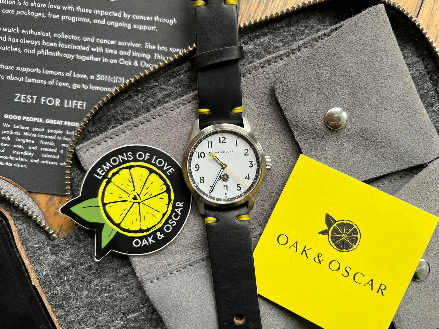 Completing the watch suite, we are including a custom Lemons of Love branded black leather watch wallet. This strong, thick black Horween leather strap was handcrafted in Indiana and is super protective and will never go out of style!